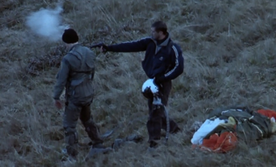Después Saša llega hasta el asiento de eyección , pero no ve a nadie. Sin embargo, Burnett salta desde un montón de nieve detrás de Saša y los dos hombres combaten cuerpo a cuerpo hasta que Burnett clava a Saša una bengala en el pecho, matándolo.