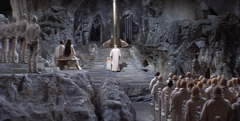 Desesperados, los dos astronautas intentan llegar al altar de la bomba para impedir que sea detonada. Llegan justo en el momento en que el Sumo Sacerdote de la bomba es asesinado por los gorilas cuando se disponía a apretar el botón rojo de detonación.