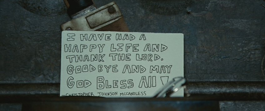 Está contento con el aislamiento, la belleza de la naturaleza y la emoción de vivir de la tierra. Caza con una calibre 22, lee libros y lleva un diario mientras prepara su nueva vida en la naturaleza. Éste es el primer momento crucial en la película, la llegada del protagonista al destino trazado en la trama paralela a la historia de la película, en el que narra toda la travesía desde su graduación, pasando por diferentes lugares y conociendo personas que los conformaron en momentos precisos.