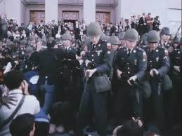 Habla como en un momento dado se rompió el cordón de seguridad y , finalmente, se llegó a un lateral del pentágono , y como un grupo de estudiantes llegó, momentaneamente, a penetran en el edificio e incluso escaló hasta un balcón. Después se ve la reacción de los militares.