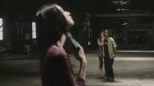 Michi luego, mientras realiza una llamada telefónica, es testigo de cómo la mujer salta al vacío desde una pilar o un silo en una fábrica de cemento. Del golpe muere "ipso facto".