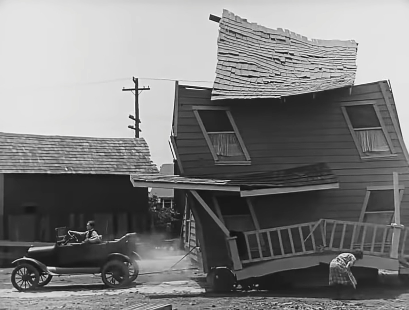 Así que vemos como Keaton al tratar de armar la casa según los planos erróneos le van a ir sucediendo todo tipo de dificultades. Lo más extraordinario es cuando le cae la pared encima salvándose por el hueco de la ventana o cuando la casa empieza a girar sobre si misma debido a la tormenta que asola la zona.